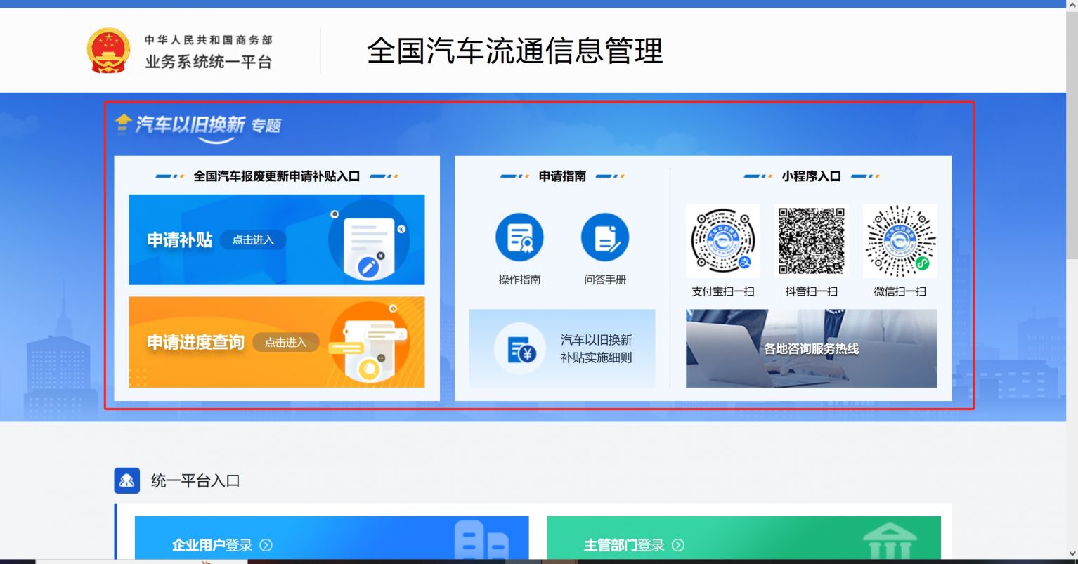 拟申请汽车报废更新补贴的个人消费者,应通过登录全国汽车流通信息管理系统网站(https://qclt.mofcom.gov.cn)或“汽车以旧换新”小程序(以下简称“全国汽车以旧换新平台”),填报个人身份信息,报废汽车的车辆识别代号和《报废机动车回收证明》《机动车注销证明》原件照片或扫描件,新车的车辆识别代号和《机动车销售统一发票》《机动车登记证书》原件照片或扫描件等,向补贴受理地(即《机动车销售统一发票》开具地)提交补贴申请。