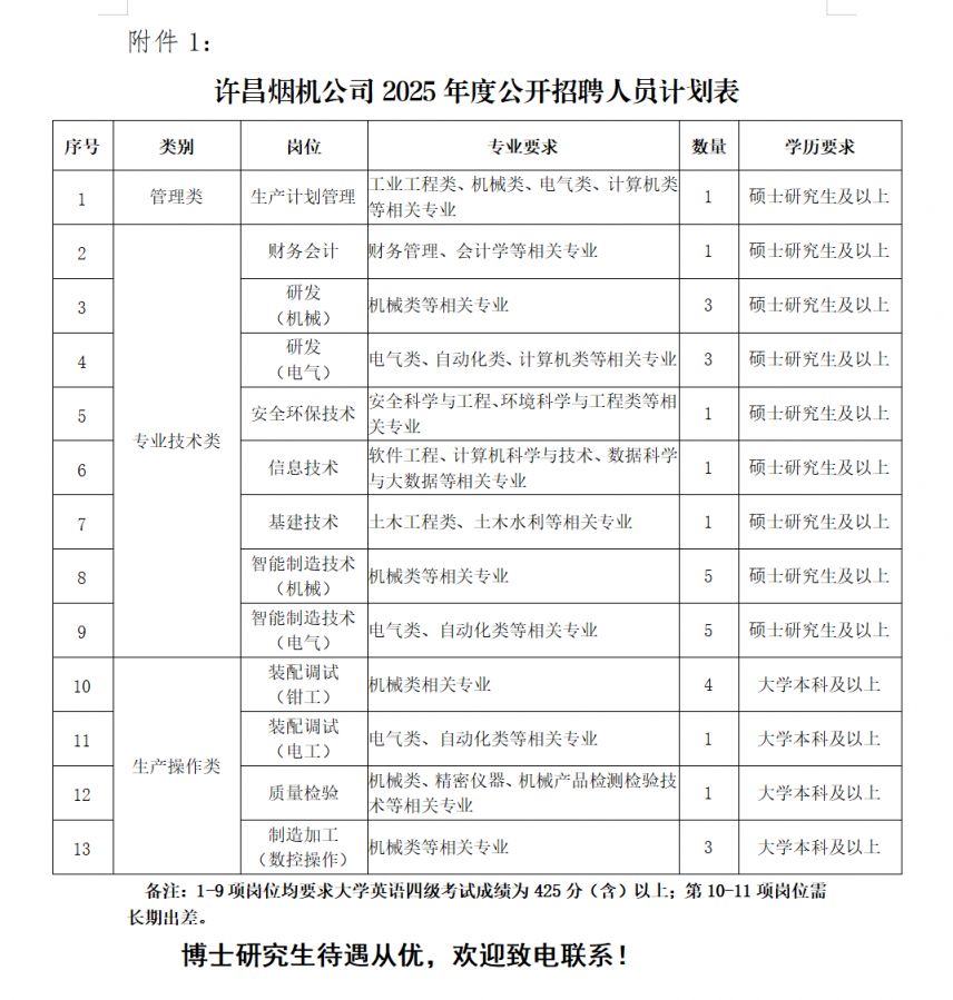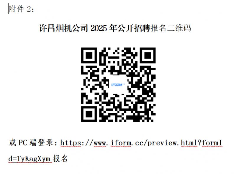 一、企业概况 许昌烟草机械有限责任公司(以下简称许昌烟机公司)于1958年建厂,1965年开始涉足烟草机械领域,2002年改制为有限责任公司,成为中国烟草机械集团有限责任公司的四大控股生产企业之一,为烟草行业提供装备支持和服务保障。公司紧密围绕“成为行业认可、社会尊重、职工满意的世界一流烟草设备制造企业”的愿景目标,稳步推进滤棒成型和辅联物流制造基地建设,近年来公司保持高质量稳定发展态势,连续被认定为“国家级高新技术企业”,产品覆盖国内所有卷烟工业企业,并远销至东南亚、欧洲、非洲、美洲等近50个国家和地区。 二、信息发布渠道 2025年度外部招聘公告在国家烟草专卖局人才招聘平台(http://www.tobacco.gov.cn/gjyc/zpxx/list.shtml)发布。 三、招聘对象 招聘范围为2025年全国普通高等院校应届毕业生(须取得相应学历、学位证书,含两年择业期内未落实工作单位的毕业生);2024年7月1日至招聘面试前取得国(境)外学位、完成教育部门学历认证且初次就业的留学回国人员。 四、基本条件 (一)应聘人员应具备下列基本条件 1.具有中华人民共和国国籍; 2.拥护中华人民共和国宪法,拥护中国共产党领导和社会主义制度; 3.具有良好的政治素质和道德品行; 4.具有正常履行职责的身体条件和心理素质; 5.具有符合招聘岗位所要求的学历、专业和工作能力; 6.与其他用人单位不存在任何形式的劳动关系,无违法犯罪及不良记录; 7.符合烟草行业、许昌烟机公司招聘回避有关规定; 8.具备招聘公告所要求的资格条件。 (二)有下列情形之一的人员,不得报名应聘 1.因犯罪受过刑事处罚的; 2.被开除中国共产党党籍的; 3.受过开除处分的; 4.被依法列为失信联合惩戒对象的; 5.其他不适宜招录的情形。 五、招聘岗位及资格条件 本次计划公开招聘30人,具体岗位、专业、学历等要求详见《许昌烟机公司2025年度公开招聘人员计划表》(附件1)。  六、报名考试时间及方式 (一)报名时间 自该公告发布次日起10天。(公告3月11日发布) (二)报名方式 请应聘者扫描“许昌烟机公司2025年公开招聘”二维码或PC端登录许昌烟机公司招聘网页(https://www.iform.cc/preview.html?formId=TyKagXym),注册并登录招聘系统后进行报名(报名二维码详见附件2)。  (三)报名要求 1.应聘者只能选择招聘计划中的1个岗位报名。 2.应聘者应真实、完整、准确填写姓名、政治面貌、出生日期、身份证号、学历、毕业院校、所学专业、手机号等报名信息,否则自行承担取消应聘资格的后果。 3.应聘者所填毕业院校和所学专业需与教育部学籍在线验证报告(境内)或教育部留学服务中心学历学位认证书(境外)保持一致。 4.应聘者将应聘登记表、个人简历、证书、承诺书、成绩单等资料打包成1个压缩包并命名为“应聘岗位+姓名+学校”上传到招聘报名系统附件中。附件务必包括下列内容: (1)《许昌烟机公司2025年度应聘人员登记表》(附件3)。 (2)个人简历及有效期内二代身份证正反面扫描件。 (3)《许昌烟机公司2025年度公开招聘应聘人员承诺书》(附件4)。 (4)学信网《教育部学籍在线验证报告》(国(境)外学历人员此项为《国外学历学位认证书》);硕士研究生(含)及以上学历人员应提供本科学历、学位等相关证件扫描件、学信网《教育部学历证书电子注册备案表》。 (5)本科成绩单扫描件、研究生成绩单扫描件等成绩单扫描件。 (6)荣获奖项、证书,以及证明自身科研成果(发表文章、专利、著作)等相关资料。 (四)考试安排 公司在报名人员中择优选择人选参加考试,请务必保持手机、邮箱等通讯顺畅。考试具体时间、地点以公司具体通知为准。 (五)考试内容 考试包括笔试和面试(为了引进亟需的高层次人才,通过资格审查的博士研究生单独组织考试,硕士研究生及以下学历应聘人员按以下考试内容执行)。 1.笔试(满分100分)。采用闭卷方式,考试科目为行政职业能力测试和申论,部分岗位根据需要增加专业知识测试。 笔试开考比例为3:1,最高比例不超过6:1。对未达到笔试最低开考比例的岗位,相应核减当次招聘人数。核减后仍无法达到最低开考比例的岗位,予以取消,该岗位报考人员可申请改报符合条件的其他岗位。 2.面试(满分100分)。根据笔试成绩从高到低择优确定进入面试人员,原则上计划招聘人数不高于2人的岗位,按照各岗位面试人数与计划录用人数的比例不超过3:1的原则确定面试人员;计划招聘人数高于2人的岗位,按照各岗位面试人数与计划录用人数的比例不超过2:1的原则确定面试人员。若同一岗位出现笔试成绩并列的,一并进入面试,面试环节出现弃权的,按照笔试成绩从高到低递补面试人员。公司招聘专家小组从基本素质、专业理论水平、技能水平、人岗匹配等维度对应聘人员进行评价打分,按照面试成绩从高到低确定考察人选。 七、结果公示 应聘者经资格审查、考试、考察、体检、公示后录用。拟录用人员在许昌烟机公司微信公众号(微信搜索“许昌烟机”)上进行公示,公示期不少于7天,公示无异议办理录用手续。 八、薪酬及福利待遇 (一)拟录用人员正式入职后按公司相关制度发放薪酬及福利、办理“六险两金”(五项社会保险、补充医疗保险、住房公积金、企业年金)。 (二)公司诚聘优秀人才,博士研究生薪酬及福利待遇实行一人一议,包括按相应岗位的高层级职务享受工资待遇、住
