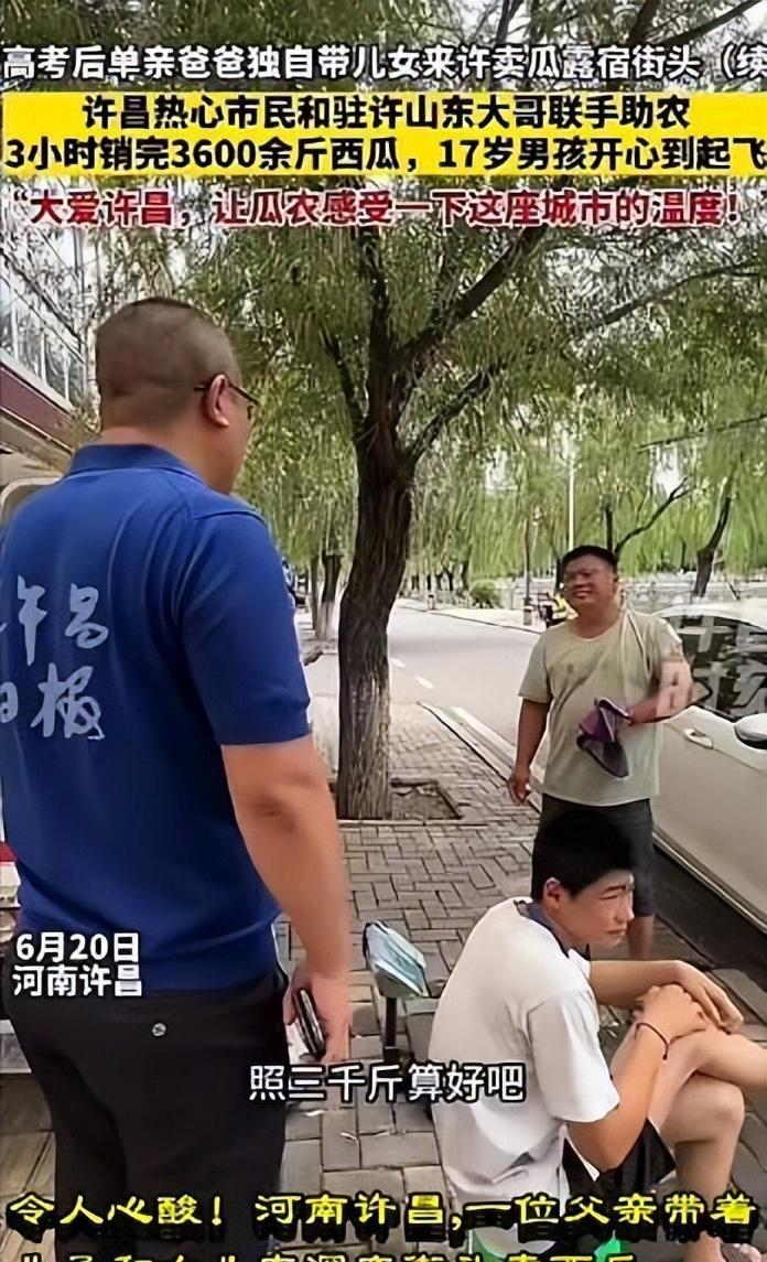 令人心酸!河南许昌,一位父亲带着儿子和女儿在深夜街头卖西瓜,有一位男子眼看一家人这么晚还不回家,于是就询问了一下那位父亲,但还没等父亲开口,儿子就说道:“姐姐考上大学了,我们要赚钱给姐姐交学费,我脑子有病,治不好了……”
