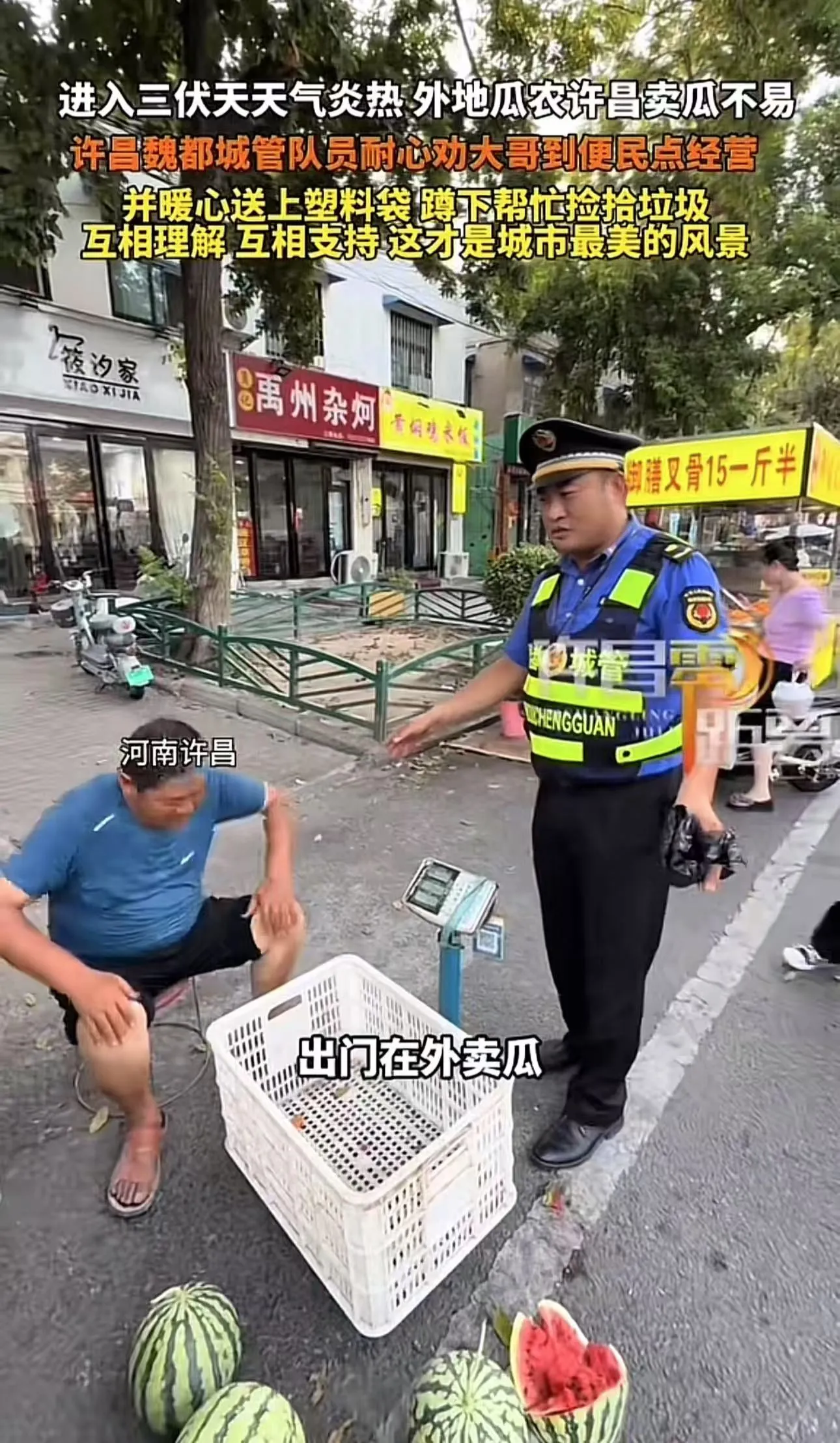 “这个城管火了!”外地瓜农在许昌摆摊卖瓜,突然城管过来让他把摊位收掉。瓜农愁坏了,不让自己摆摊这么多西瓜怎么办?可城管却说:“我不是不让你摆,而是让你到便民点去摆,你虽然大老远过来不容易,但也不能占道经营!”网友:这才是城市最美的风景!