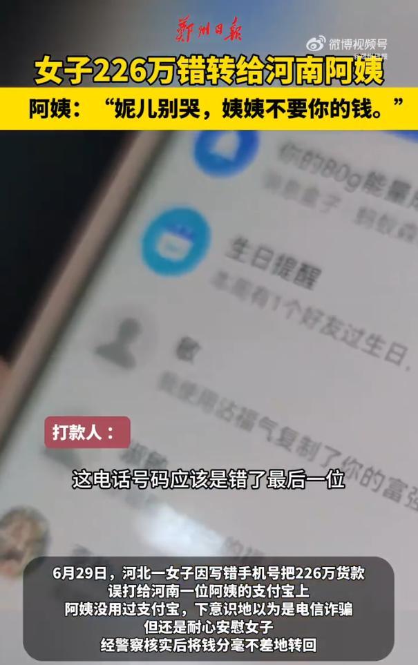暖哭了!河南许昌,大妈手机显示一外地陌生来电,连着打了6、7次,大妈才敢接,就听到对面女子的哭着说,姨姨,我226万货款打你支付宝上了!大妈以为是诈骗,赶紧告诉了女儿,随后,大妈的女儿报了警,没想到,大妈的做法让众人感动,网友:报警做对了!