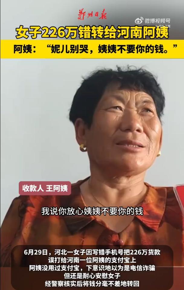 警察很快就来了,他们查了查王秀兰的支付宝,嘿,还真多了226万!原来,打电话的是河北的田女士,她输手机号时错了一位,钱就跑到王秀兰账上了。知道事情原委后,王秀兰二话不说,立马和警察一起把钱给田女士退了回去。她还宽慰田女士:“孩子,别哭了,阿姨不会要你的钱的。”田女士心里特别感激,过了几天,她特地从河北跑到许昌,给王秀兰送上了一面锦旗,上面写着“心里感恩,大好人一家”,还不停地跟王秀兰说谢谢。