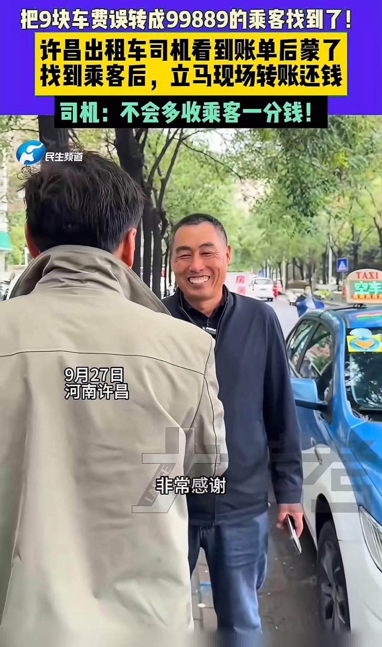 “这个出租车司机火了!”河南许昌,乘客误将9元车费转成99889元,出租车司机发现这笔“天降横财”以后,毅然而然地做出一个感人的举动!网友:羡慕他打车能遇到这样的司机,更羡慕他的余额,我犯不了这样的错。